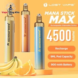 Pod Hút 1 Lần Mana Stick Max 4500 hơi là một trong những dòng pod max luôn cháy hàng trên toàn thế giới. Mana Stick Max được ra mắt bởi Lost Vape – nhà sản xuất thiết bị AIO được yêu thích nhất. Bạn có thể khui hộp và thưởng thức ngay em vape hoàn hảo này. Lên đến 4500 hơi, bạn có thể thoải mái thưởng thức trọn vẹn hương vị khó quên, tận hưởng khoái cảm bền lâu mà Mana mang lại. Lost Vape đã thiết kế mỗi que max với 50mg nicotine cùng với bình chứa 1,2ml và pin 270 mAh.